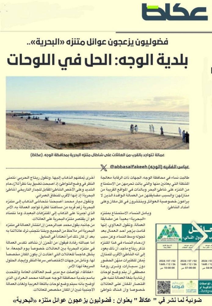 تدخلت بلدية محافظة الوجه لتلبية طلبات نساء المحافظة بوضع لوحات توعوية في مدخل متنزه البحرية للتأكيد على حق العائلات في الاستمتاع بالمكان دون تداخل العمالة الوافدة. تم وضع لوحات بالعربية والإنجليزية والأوردية للتواصل مع العمالة الوافدة من باكستان والهند وبنغلاديش ونيبال وأفغانستان. كما تم تخصيص موظفين لتوجيه العمالة إلى مناطق أخرى وتذكيرهم بأن المتنزه مخصص للعائلات فقط. تم تنفيذ هذه الخطوات بإشراف بلدية الوجه لتحقيق التوازن في استخدام المساحات العامة بمحافظة الوجه.