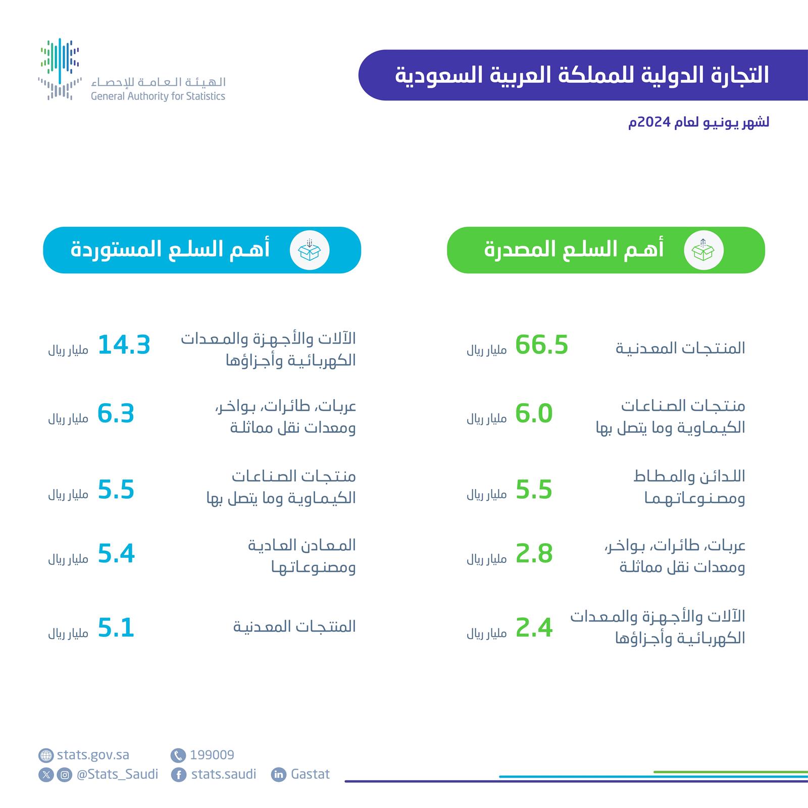 أعلنت الهيئة العامة للإحصاء ارتفاع الصادرات غير البترولية بنسبة 10.5% في الربع الثاني من عام 2024م، وانخفضت قيمة الواردات بنسبة 5.6%. وأظهرت النشرة انخفاض الصادرات السلعية وزيادة الواردات في الفترة نفسها. كما ارتفعت واردات المملكة وانخفض الفائض التجاري السلعي. قيمة الصادرات الغير بترولية في شهر يونيو 2024 بلغت 21.6 مليار ريال، بزيادة 1.5 مليار ريال عن يونيو 2023. وقيمة الصادرات البترولية تراجعت بنسبة 9.3% خلال نفس الفترة. الصادرات السلعية والواردات انخفضت في يونيو 2024 مقارنة بيونيو 2023.