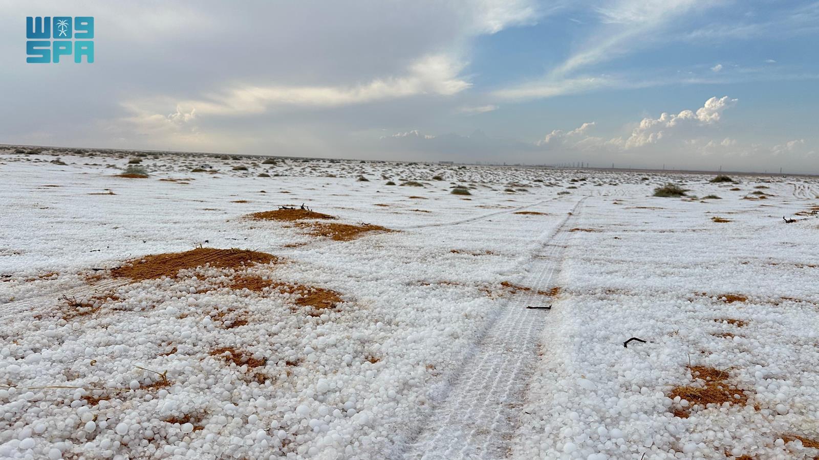 تساقطت زخات البرد والأمطار على منطقة الجوف في السعودية، مما أدى إلى اكتساء الأرض باللون الأبيض وتدفق الشعاب. ومنذ الأربعاء الماضي، استمرت الأمطار الغزيرة وتساقط البرد على أجزاء مختلفة من المنطقة، مما يعد بموسم ربيعي جذاب بنمو النباتات البرية الموسمية. وحسب تنبؤات الأرصاد، من المتوقع استمرار حدوث سحب رعدية ممطرة ورياح شديدة وجريان السيول خلال الأيام القادمة.