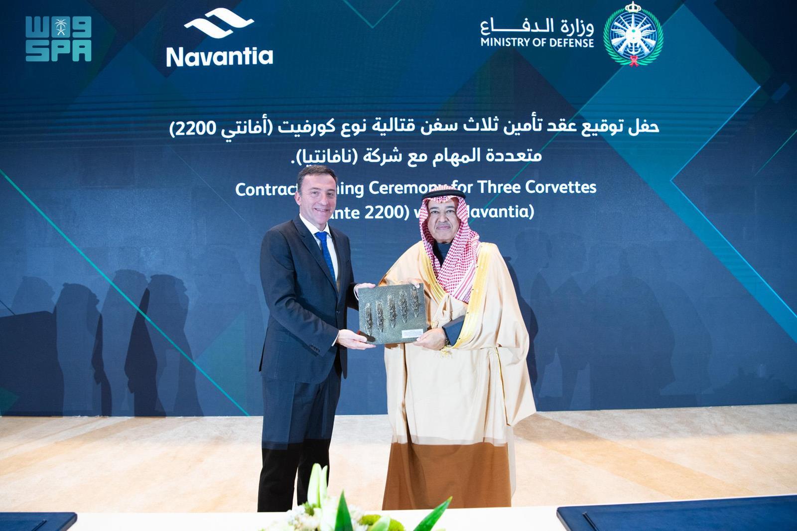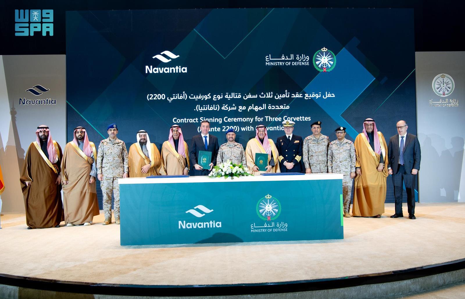 وقَّعت وزارة الدفاع في الرياض، اليوم، عقدًا مع شركة نافانتيا الإسبانية للاستحواذ وتوريد ثلاث سفن قتالية متعددة المهام من طراز “كورفيت أفانتي 2200” ، لصالح القوات البحرية الملكية السعودية، بحضور معالي رئيس هيئة الأركان العامة الفريق الأول الركن فياض بن حامد الرويلي.