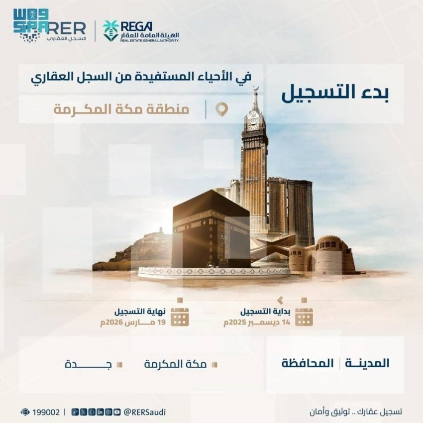 ودعا السجل العقاري ملاك العقارات الواقعة ضمن المواقع المشمولة إلى استكمال التسجيل قبل نهاية يوم 19 مارس 2026م، مؤكدًا إمكانية التحقق من شمول العقار عبر منصة السجل العقاري أو تطبيق السجل العقاري، كما خصص مركز خدمة العملاء على الرقم 199002 للإجابة عن الاستفسارات وشرح خطوات التسجيل.