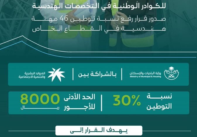 وأوضحت الوزارة أن القرار الأول يقضي برفع نسبة التوطين في المهن الهندسية إلى 30%، إلى جانب رفع الحد الأدنى للأجور إلى 8000 ريال في القطاعين الخاص وغير الربحي، وذلك بالشراكة مع وزارة البلديات والإسكان. ويطبق القرار على المنشآت التي يعمل بها (5) عاملين فأكثر من المهن الهندسية، وفق التعريفات والمسميات المهنية المعتمدة، ويشمل (46) مهنة هندسية من أبرزها: مهندس معماري، مهندس توليد طاقة، مهندس صناعي، مهندس إلكترونيات، مهندس مركبات، مهندس بحري، مهندس صحي وغيرها.